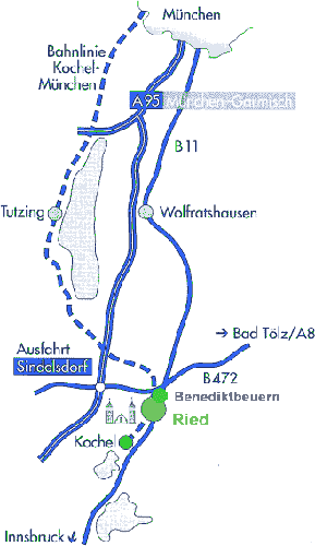 Ried gehört zur Gemeinde Kochel am See im oberbayerischen Landkreis Bad Tölz - Wolfratshausen. Es liegt nahe dem Kloster Benediktbeuern am Fuße der 1801 Meter hohen Benediktenwand.